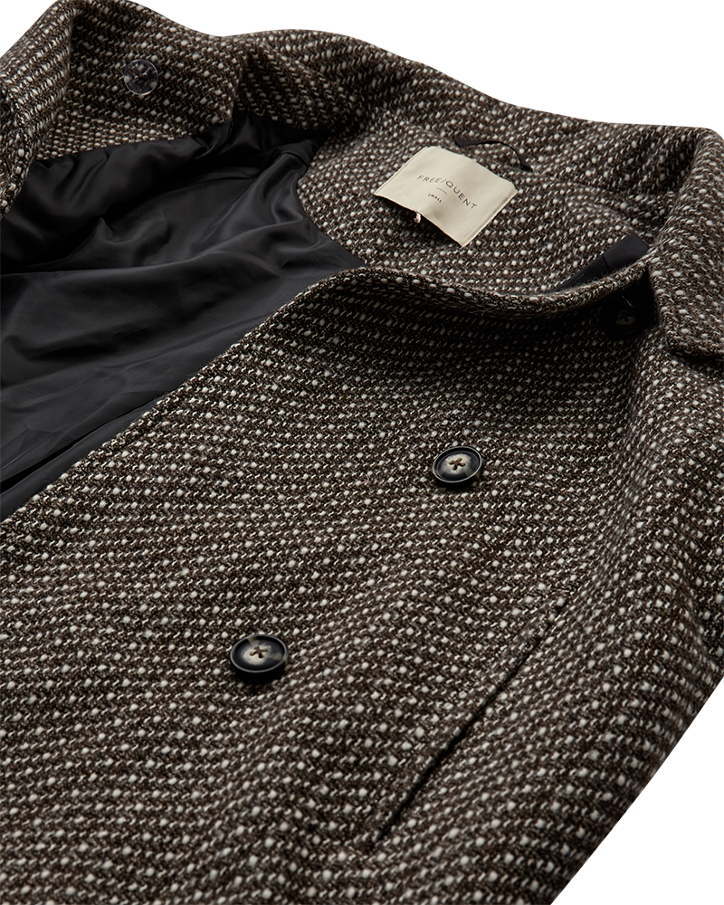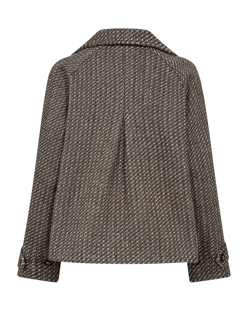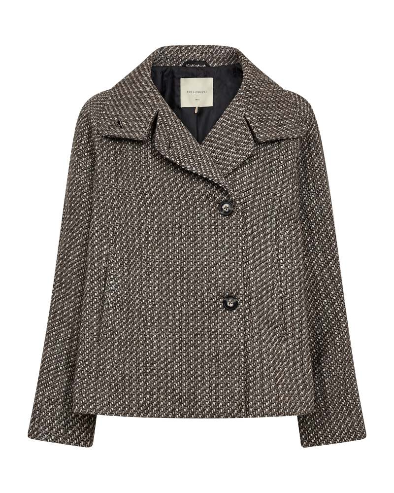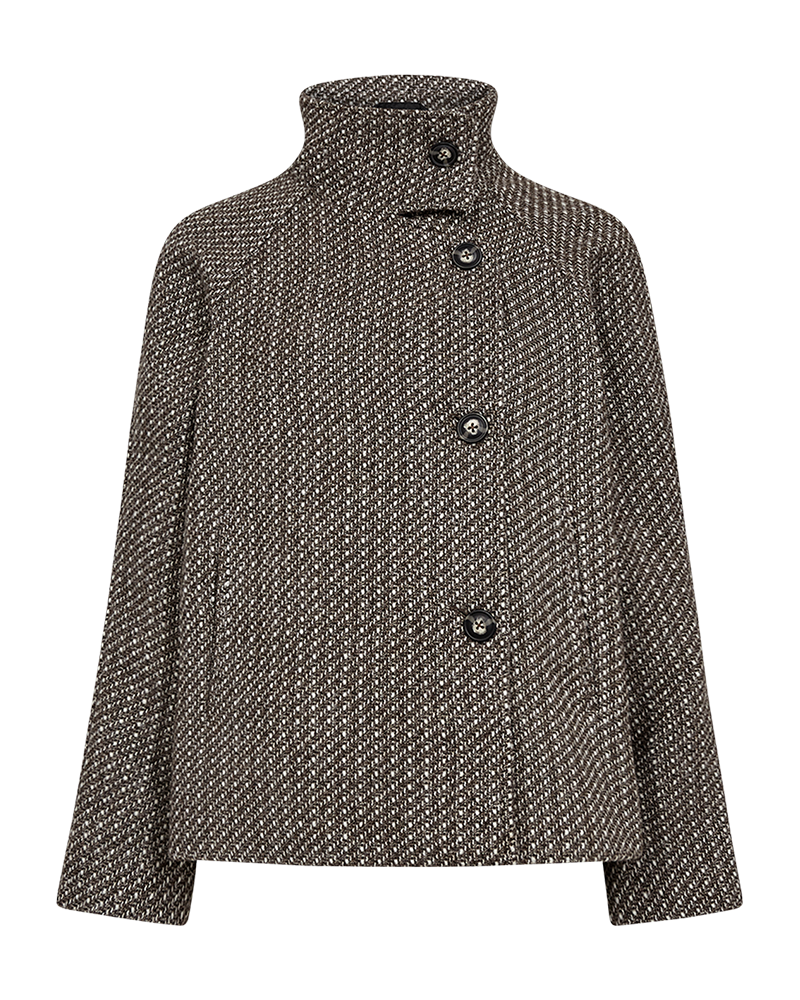 Jacke von Freequent aus einem weichen Stoff mit schöner Struktur. Die Jacke hat lange Ärmel, Hornknöpfe auf der Vorderseite, einen hohen Kragen, eine Kellerfalte am Rücken sowie eine lockere Passform.