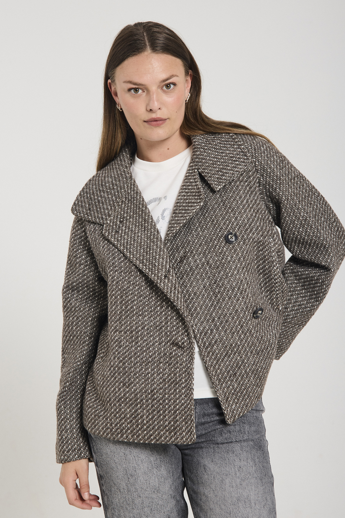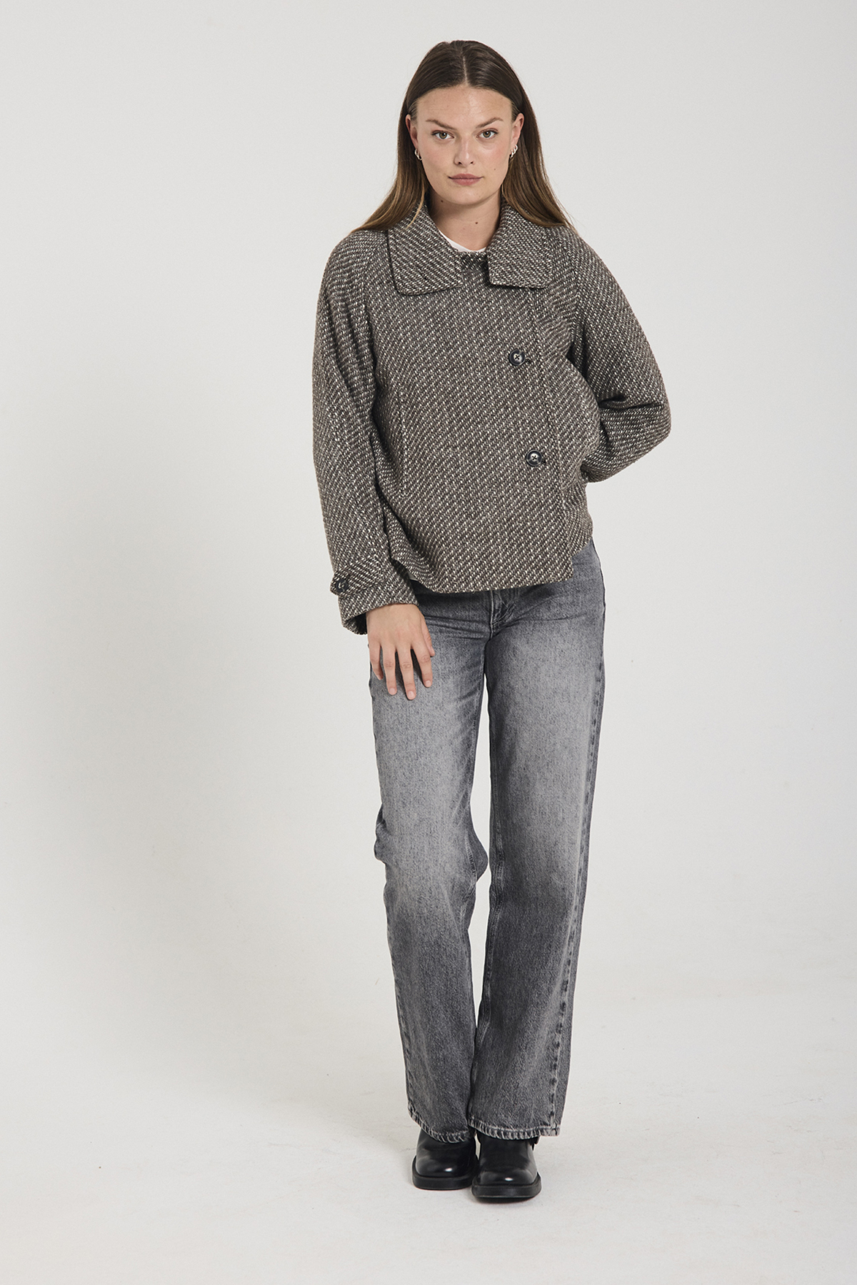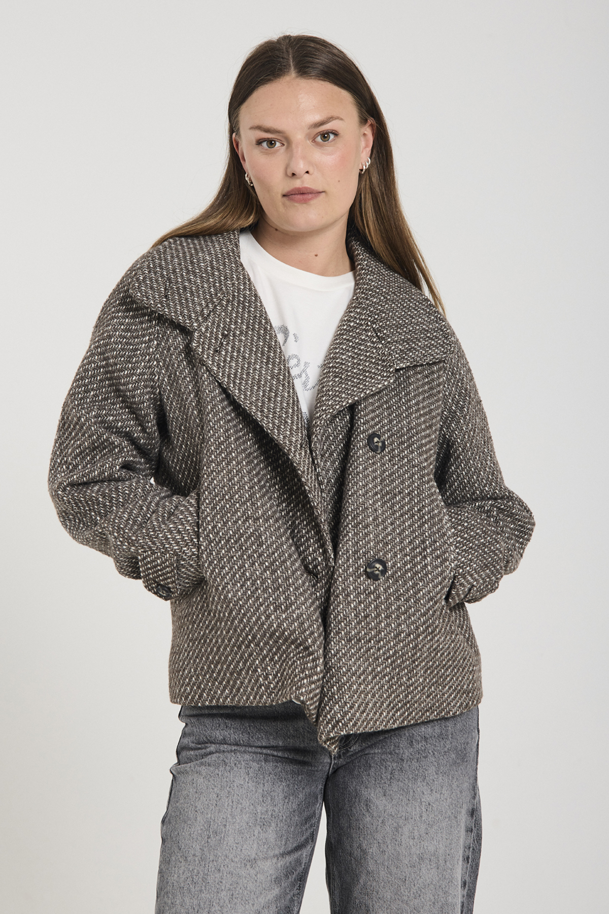Jacke von Freequent aus einem weichen Stoff mit schöner Struktur. Die Jacke hat lange Ärmel, Hornknöpfe auf der Vorderseite, einen hohen Kragen, eine Kellerfalte am Rücken sowie eine lockere Passform.