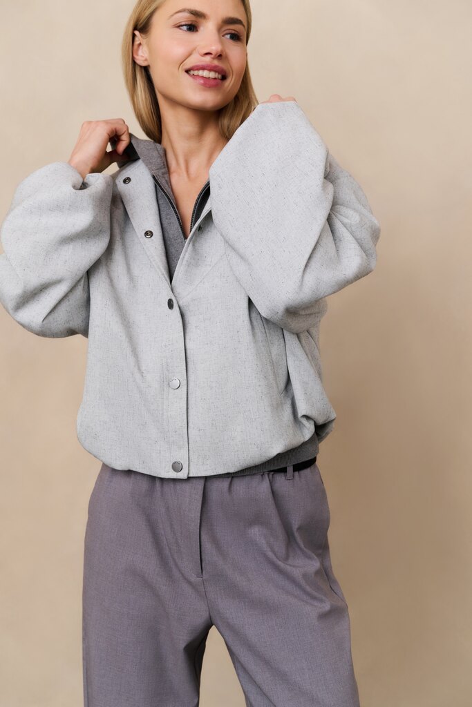 Diese bequeme Jacke besticht durch eine dezente Ballon-Silhouette, die durch den elastischen Saum betont wird. Sie hat einen Stehkragen, überschnittene Schultern, lange Ärmel und einen matten Druckknopfverschluss. Der weiche Webstoff und das minimalistische Design machen sie ideal für einen modernen, lässigen Look.