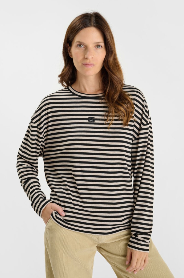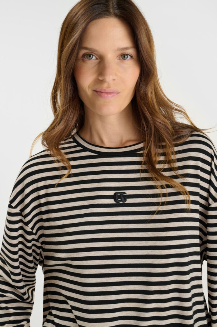 Modisches Streifen Shirt mit langen Ärmeln. Relaxed Fit und leicht überschnittenen Schultern. Logo Stickerei auf der Vorderseite. Runder Halsausschnitt.