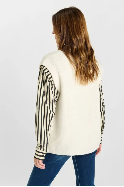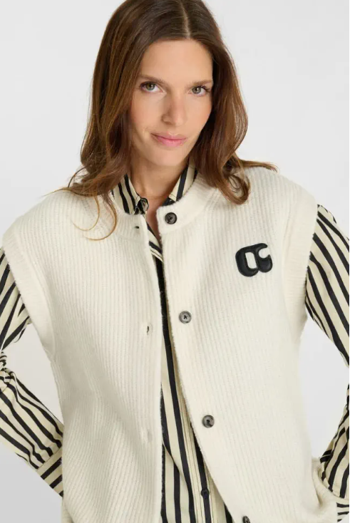 Lange, ärmellose Strickjacke, cremefarben, geknöpft, Monogrammpatch.