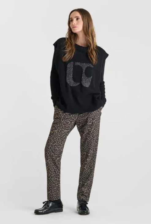 Schwarzer ärmelloser Pullover mit glänzendem Monogramm.