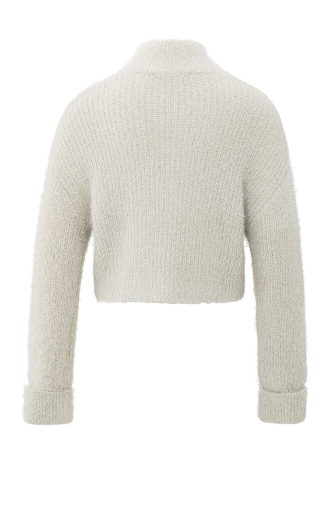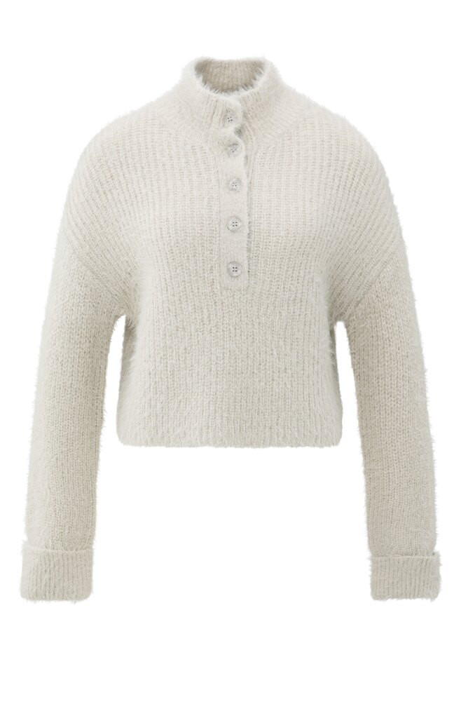 Dieser weiche, flauschige Pullover hat eine moderne, kurz geschnittene Passform und einen Stehkragen mit elegantem Knopfverschluss. Die langen Ärmel mit umgeschlagenen Bündchen verleihen ihm eine lässige Note. Der Pullover ist aus einer bequemen, flauschigen Stoffmischung gefertigt, die sich wunderbar weich anfühlt. Ein stylishes Modell, das Komfort und zeitgenössisches Flair in deine Alltagsgarderobe bringt.