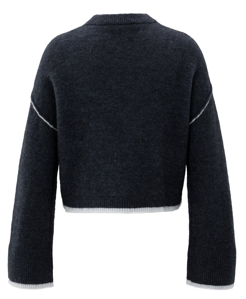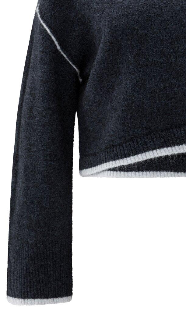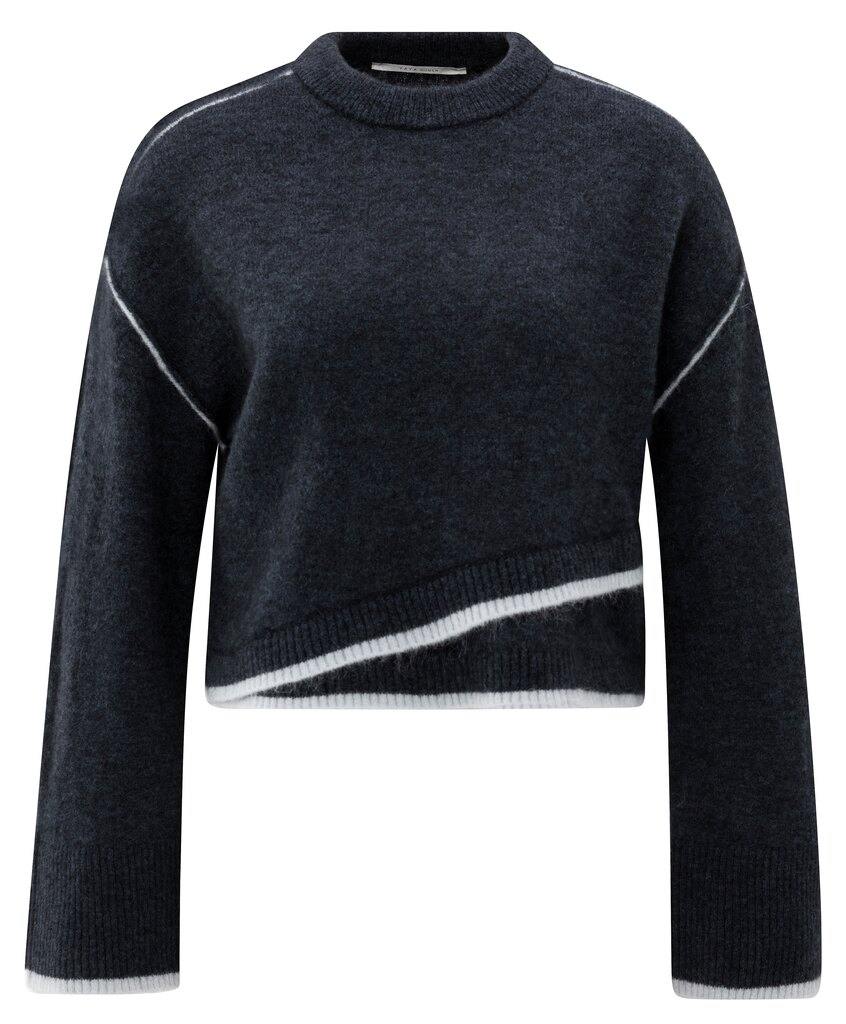 Dieser weiche Strickpullover hat eine kurze, gerade Passform und dezente Kontrastlinien an Saum, Bündchen und Schulternähten. Der Rundhalsausschnitt und die überschnittenen Schultern sorgen für einen entspannten Tragekomfort, während der diagonale Schnitt für eine verspielte Note sorgt. Ein modernes Kleidungsstück, das Komfort und Stil vereint.