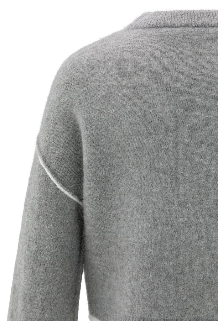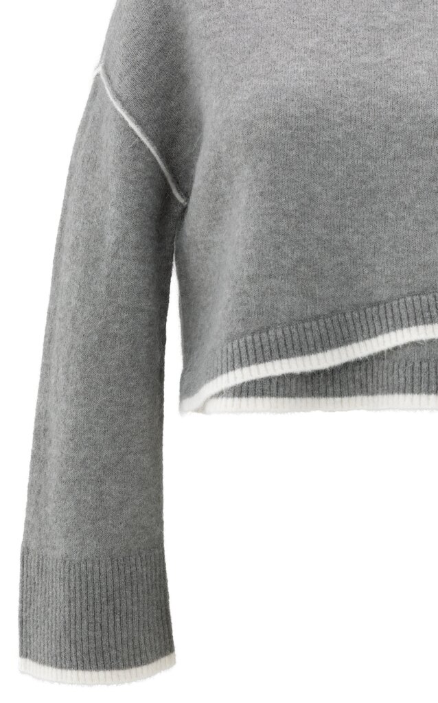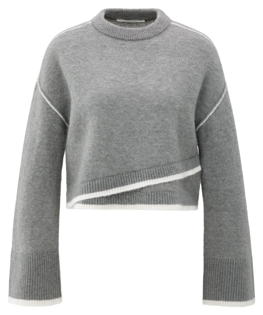 Dieser weiche Strickpullover hat eine kurze, gerade Passform und dezente Kontrastlinien an Saum, Bündchen und Schulternähten. Der Rundhalsausschnitt und die überschnittenen Schultern sorgen für einen entspannten Tragekomfort, während der diagonale Schnitt für eine verspielte Note sorgt. Ein modernes Kleidungsstück, das Komfort und Stil vereint.