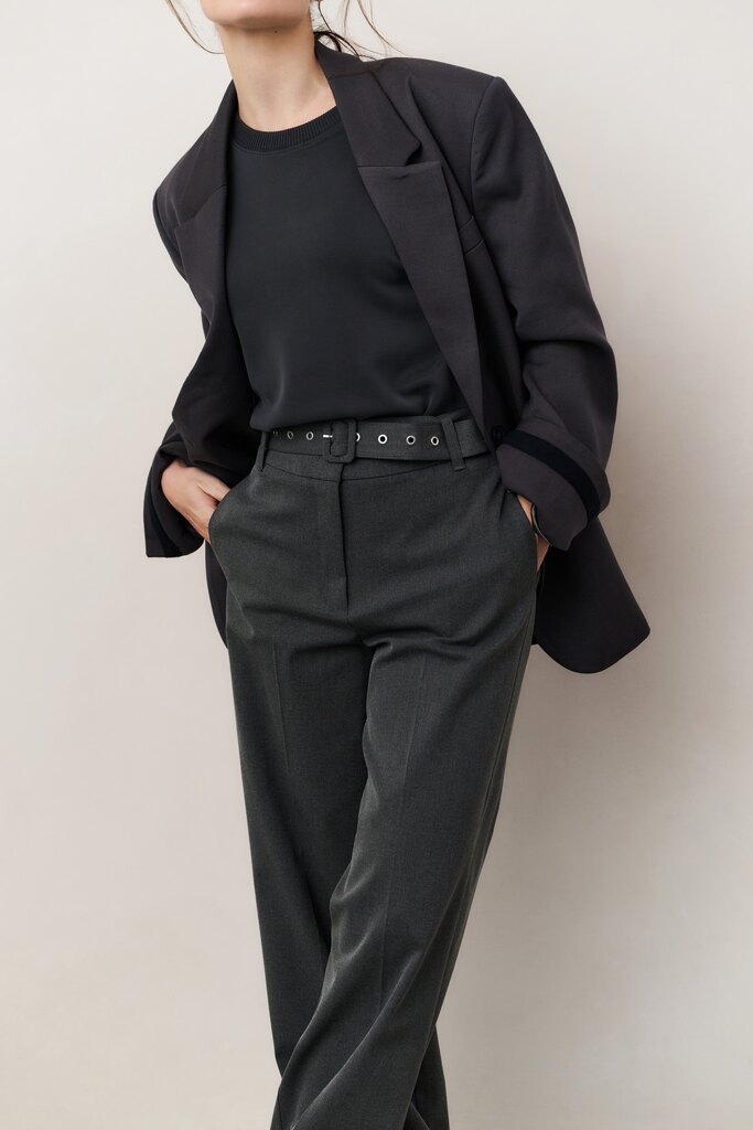 Dieses moderne T-Shirt ist aus glattem, strukturiertem Stoff gefertigt und hat kurze Ärmel und eine normale Passform. Der gerippte Strickausschnitt verleiht dem minimalistischen Design eine subtile Note. Dank des angenehmen Tragegefühls und der klaren Verarbeitung eignet sich dieses Stück perfekt für einen lässigen und dennoch eleganten Look.