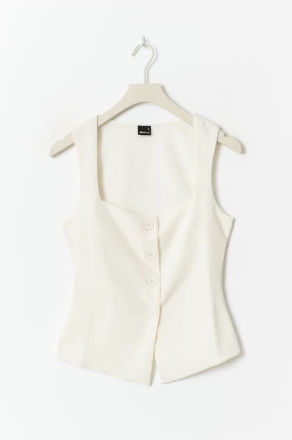 Weste aus Jersey mit Knöpfen. Die Weste ist weiβ und hat tiefen Ausschnitt. Sie hat figurbetonte Passform, elastische Qualität, ärmelloses Design, gefütterten Vorderteil und normale Länge.