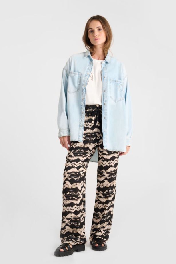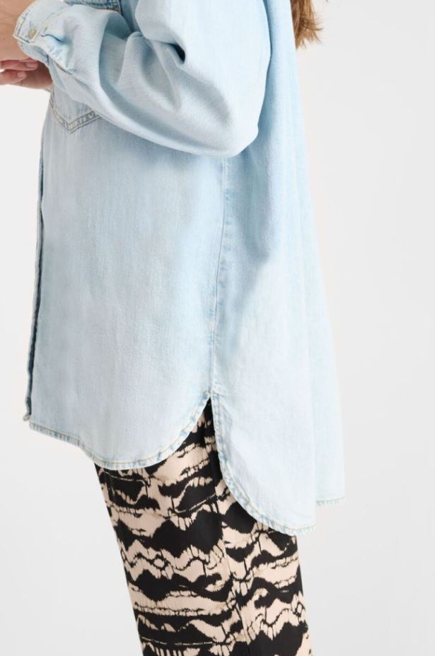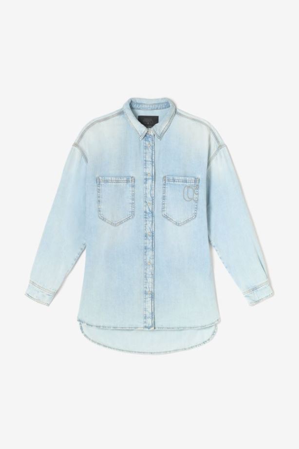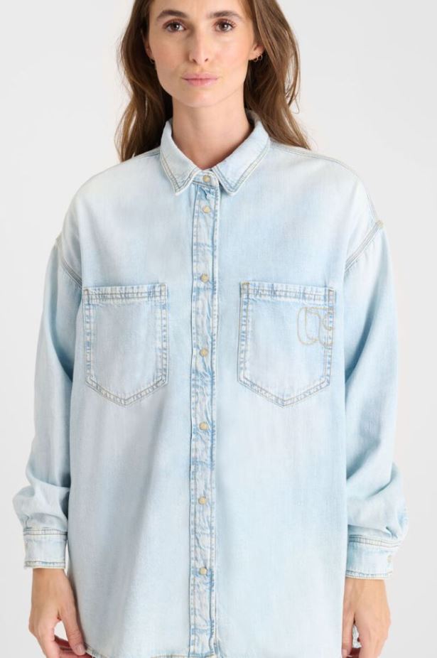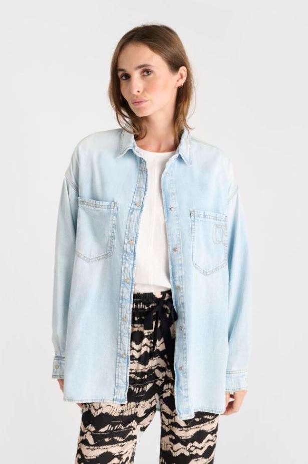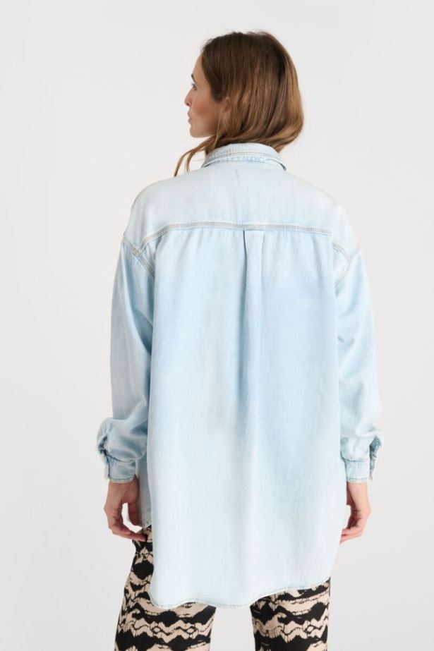 Oversize-Hemd aus verwaschenem blauem Jeansstoff mit aufgesetzten Taschen.