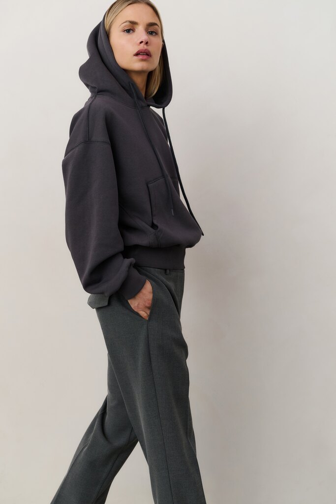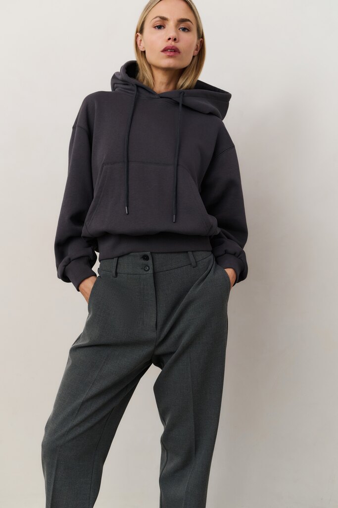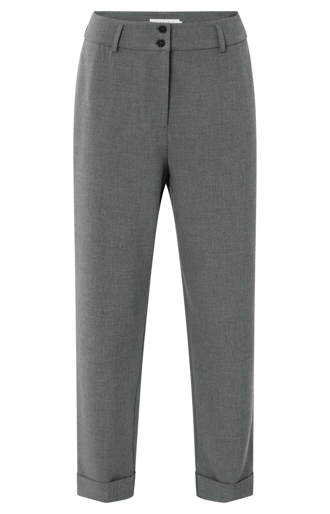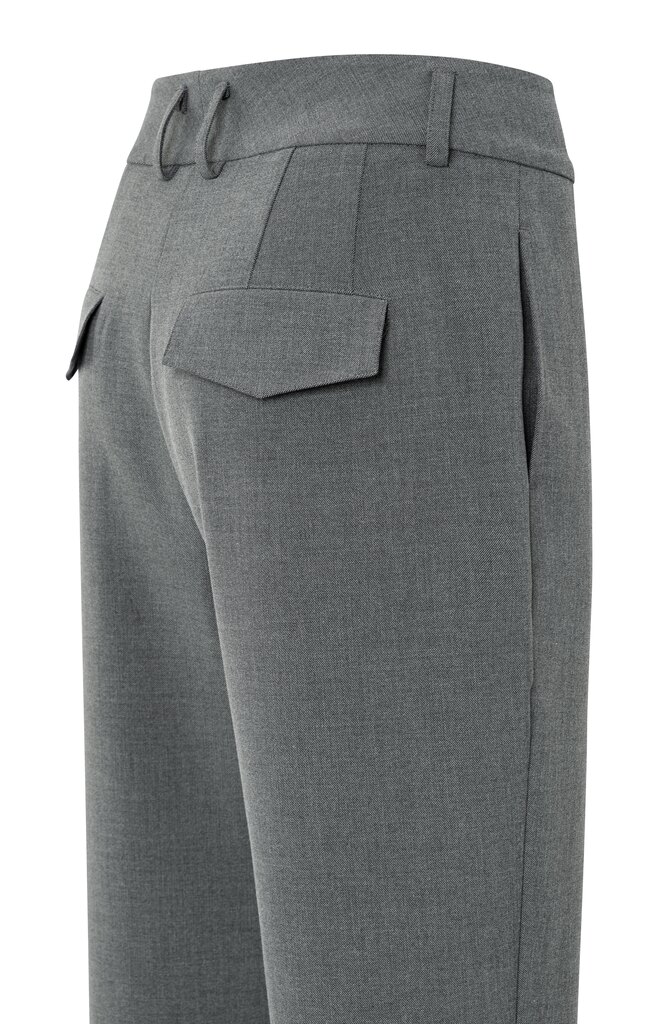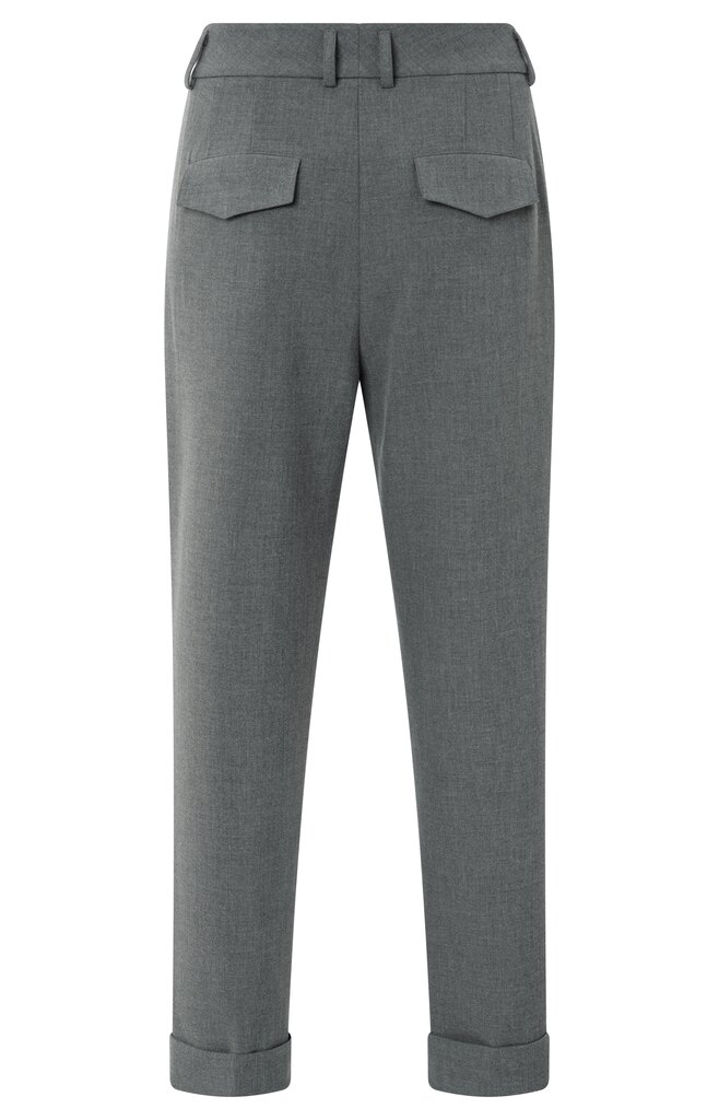 Diese elegante Hose hat eine normale Passform, eine hohe Taille, gerade Beine und eine klare Silhouette. Hergestellt aus einem weichen, gewebten Stoff mit dezenter Textur. Mit Seitentaschen, geknöpften Gesäßtaschen und einem Doppelknopfverschluss vorne. Die fixierten Umschläge am Saum setzen ein raffiniertes
