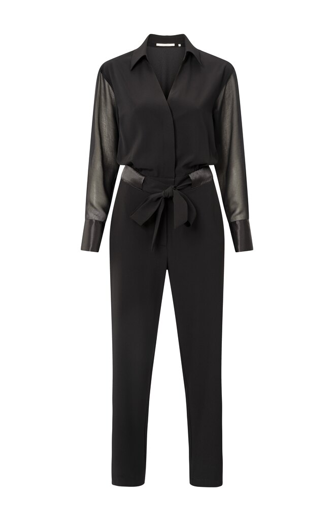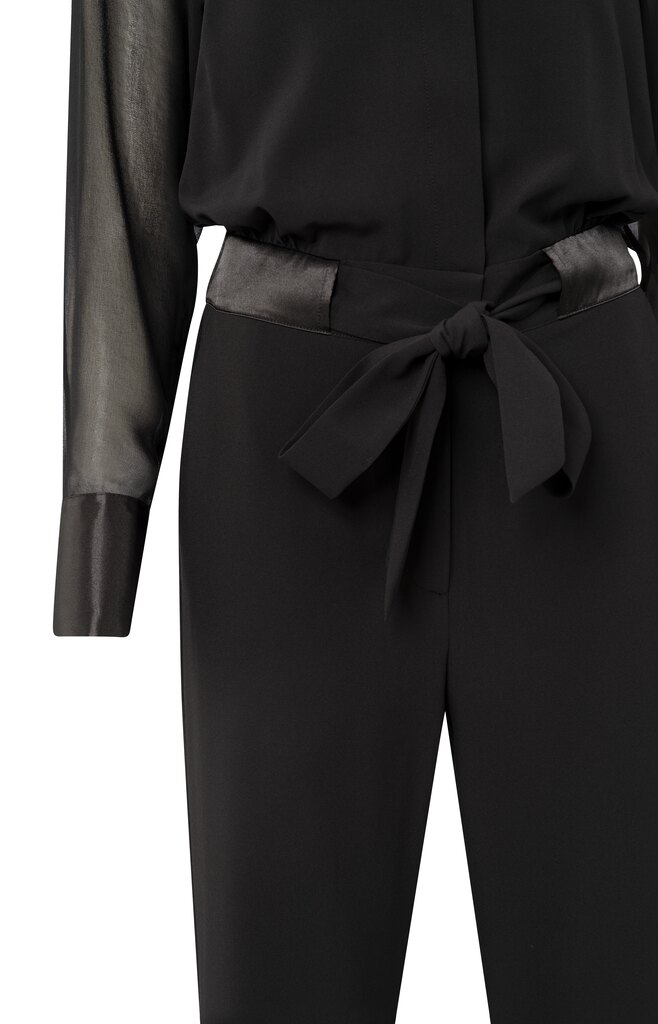 Dieser elegante Jumpsuit aus glattem gewebtem Stoff begeistert mit langen durchsichtigen Ärmeln mit Satinbündchen. Dank seinem elastischen Bund und seinem Bindegürtel hat er eine schmeichelhafte, feminine Silhouette. Der klassische Kragen und der verdeckte Knopfverschluss sorgen für einen edlen Look. Die perfekte Wahl für ein mühelos schickes Outfit mit einer modernen Note.